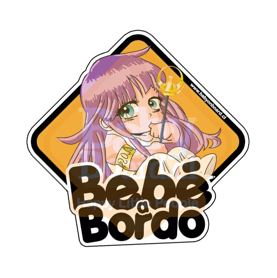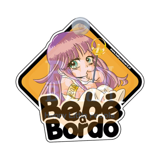 Letrero bebé a bordo inspirado en Saori Kido, la reencarnación de Atenea en Caballeros del Zodiaco. Un diseño lleno de elegancia, protección y estilo anime, ideal para quienes crecieron con esta serie y hoy quieren cuidar a su peque en cada viaje.