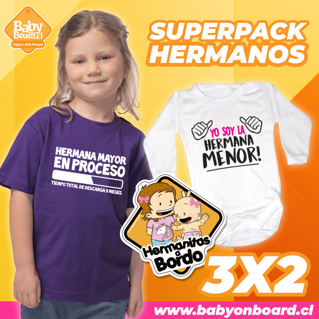 Polera Hermana Mayor en Proceso + Body Yo soy la Hermana Menor + Letrero Hermanitas a Bordo